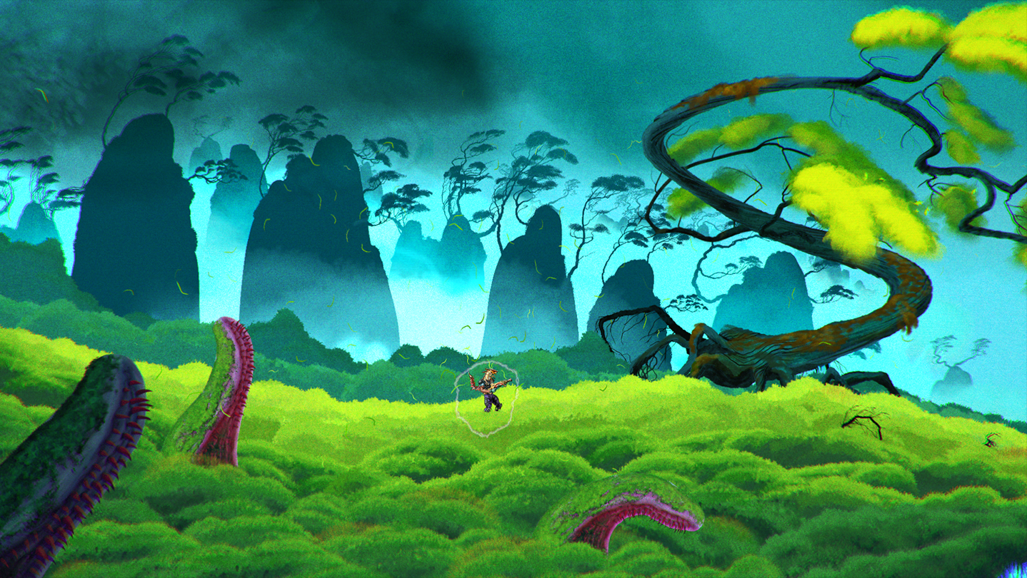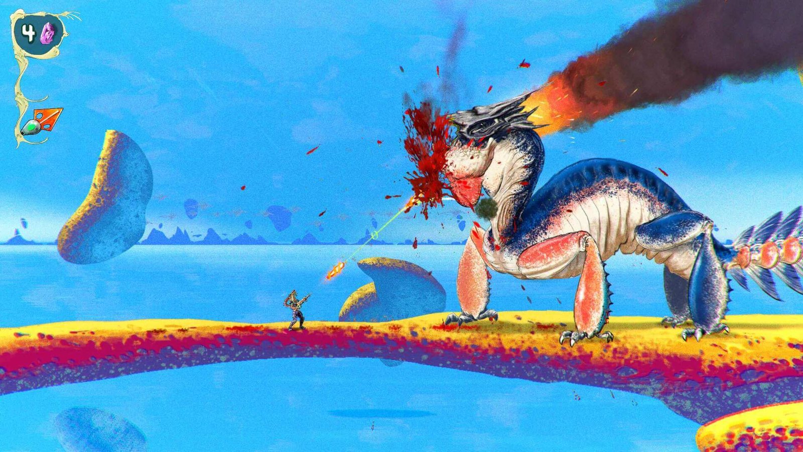 Essa fusão vai muito além de apenas mantê-lo vivo, mas também lhe concede habilidades especiais e uma ligação direta com o ChainStaff, a arma principal do jogo. A narrativa simples cumpre bem seu papel e se sustenta graças ao humor apresentado. Além disso, o clima absurdo apresentado, lembra muito uma fusão de Contra e Earthworm Jim, trazendo estranheza, mas muito ação.