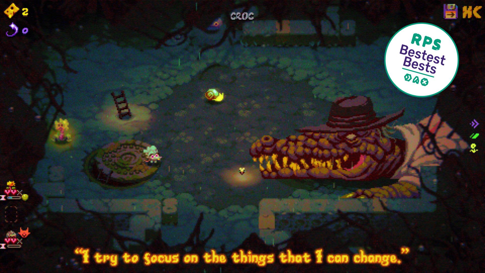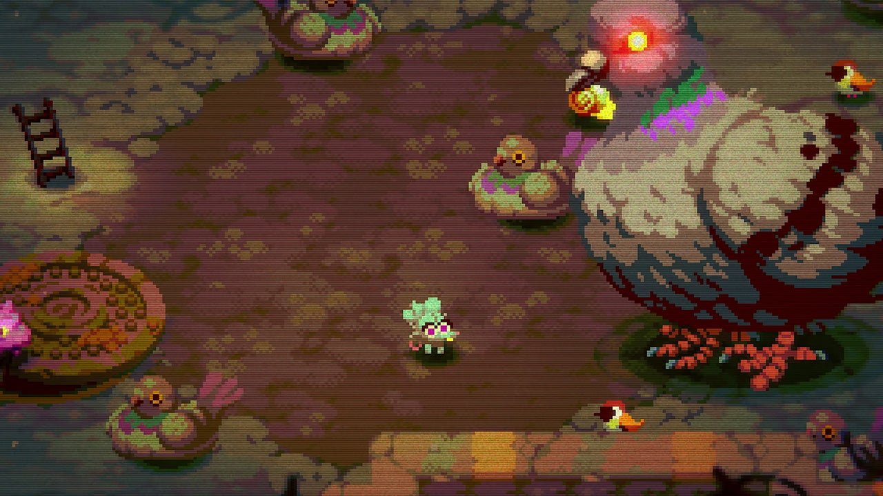 Outro grande destaque de Morsels é sua estética pixelada que imita um CRT mal sintonizado, com filtros que intensificam a atmosfera “suja” do jogo. É um visual cheio de estilo que saiu do fundo de um porão, mas extremamente funcional e nada confuso. Projeteis, inimigos e efeitos são sempre legíveis, mesmo quando temos diversos inimigos e balas percorrendo a tela.